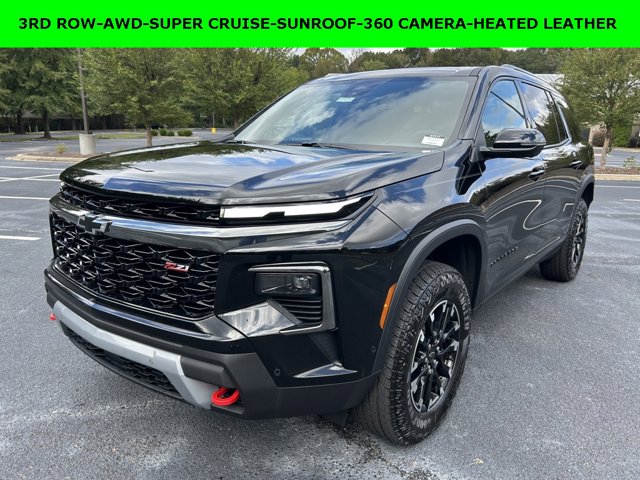 iPhone/ Android Navigation compatible, Automatic Headlights, Rearview Camera, Bluetooth®, Leather, Sunroof / Moonroof, Heated Front Seats, Heated Steering Wheel, Remote Starter System, Bose Premium Speaker System, Mutli-function Steering Wheel, 4X4, Apple Carplay, ONSTAR, 3rd Row Seats, Push Button Start, Remote Keyless Entry, Andoid Auto, Premium Delivery Service Available, Traverse Z71, 4D Sport Utility, AWD, Mosaic Black Metallic, Jet Black w/Torch Red Stitching w/Evotex Seat Trim, Active Noise Cancellation, Apple CarPlay/Android Auto, Automatic temperature control, Bose Premium 12-Speaker Audio System Feature, Driver ATTENTION ASSIST®, Driver Confidence Package, Emergency communication system: OnStar, Enhanced Automatic Parking Assist, Enhanced Driving Package, Evotex Seat Trim, Front dual zone A/C, HD Surround Vision, Heated Driver & Front Passenger Seats, Heated front seats, Heated steering wheel, Low tire pressure warning, Navigation System, Occupant sensing airbag, Power driver seat, Power Dual Glass Panoramic Sliding Sunroof, Power Liftgate, Power Outlet, Preferred Equipment Group 2Z7, Radio: Audio System w/17.7″ Diagonal Display, Rear air conditioning, Rear anti-roll bar, Rear Camera Mirror, Rear Pedestrian Alert, Rear window wiper, Remote keyless entry, SiriusXM w/360L Trial Subscription, Super Cruise, Telescoping steering wheel, Tilt steering wheel, Traffic Sign Recognition, Wheels: 18″ High Gloss Black Painted Aluminum. 2026 Chevrolet Traverse Z71 Mosaic Black Metallic 4D Sport Utility 2.5L DOHC AWD 8-Speed Automatic 19/24 City/Highway MPG