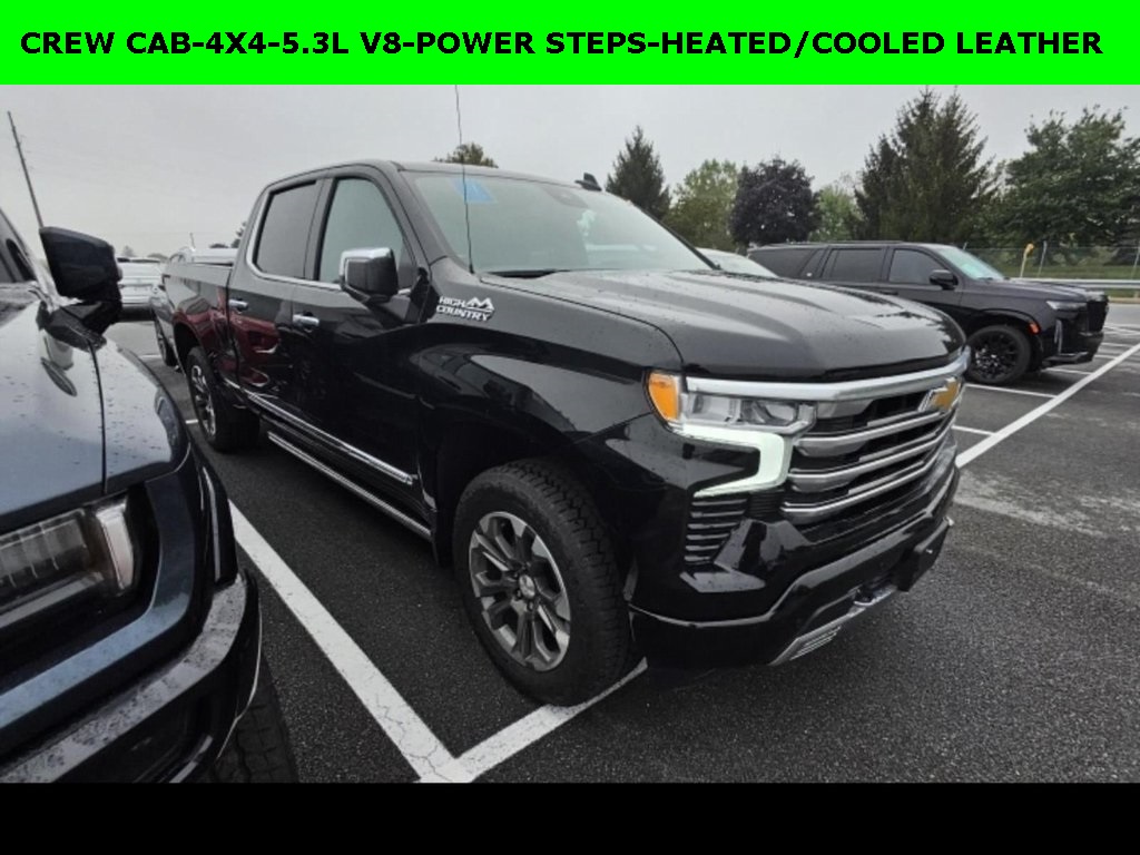 New ARRIVAL PHOTOS COMING SOON!, iPhone/ Android Navigation compatible, Automatic Headlights, Rearview Camera, Bluetooth®, Leather, Towing Package / Hitch, Bedliner, Running Boards, Heated and Vented Front Seats, Heated 2nd Row, Heated Steering Wheel, Remote Starter System, EZ Lift and Lower Tailgate, LED Cargo Box Lighting, Bose Premium Speaker System, Mutli-function Steering Wheel, 4X4, Includes the Remainder of the Factory Warranty, Extended Warranty Available, Apple Carplay, ONSTAR, Push Button Start, Remote Keyless Entry, Andoid Auto, Premium Delivery Service Available, Silverado 1500 High Country, 4D Crew Cab, EcoTec3 5.3L V8, 10-Speed Automatic, 4WD, Black, Jet Black w/Perforated Leather Seat Trim, 10-Way Power Driver Seat w/Lumbar, 10-Way Power Passenger Seat Adjuster w/Lumbar, 12.3″ Multicolor Reconfigurable Digital Display, 120-Volt Interior Power Outlet, 2 USB Data Ports, 2nd Row Heated Outboard Seats, Adaptive Cruise Control, Auto-Dimming Inside Rear-View Mirror, Auto-Locking Rear Differential, Bed View Camera, Bluetooth® For Phone, Body-Color Painted Mirror Caps, Chevytec Spray-On Black Bedliner, Chrome Assist Steps, Chrome Recovery Hooks, Color-Keyed Carpeting Floor Covering, Deep-Tinted Glass, Driver Memory, Dual Exhaust w/Polished Outlets, Dual Rear USB Ports (Charge Only), Floor Mounted Center Console, Front Carpeted Floor Mats, Front LED Fog Lamps, Front Rain-Sensing Wipers, HD Surround Vision, Heated Driver & Front Outboard Passenger Seats, Heated Steering Wheel, High Capacity Suspension Package, Hitch Guidance w/Hitch View, In-Vehicle Trailering System App, Integrated Trailer Brake Controller, Keyless Open & Start, LED Cargo Area Lighting, Navigation System, OnStar & Chevrolet Connected Services Capable, Outside Heated Power-Adjustable Mirrors, Perimeter Lighting, Power Front Passenger Windows w/Express Up/Down, Power Front Windows w/Driver Express Up/Down, Power Rear Windows w/Express Down, Power Sliding Rear Window w/Rear Defogger, Power Tailgate, Power Tilt & Telescoping Steering Column, Preferred Equipment Group 3LZ, Rear Carpeted Floor Mats, Rear Cross Traffic Braking, Rear Pedestrian Alert, Rear Wheelhouse Liners, Remote Vehicle Starter System, Safety Alert Seat, SiriusXM w/360L, Standard Tailgate, Steering Wheel Audio Controls, Theft Deterrent System (Unauthorized Entry), Trailer Camera Provisions, Trailer Side Blind Zone Alert, Trailering Package, Ultrasonic Front & Rear Park Assist, Universal Home Remote, Up-Level Rear Seat w/Storage Package, Ventilated Driver & Front Passenger Seats, Wrapped Steering Wheel.